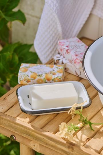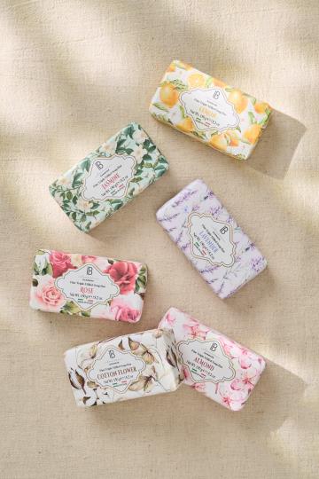 Fast sæbe produceret i Italien, pakket i dekorativt papir. Fås i seks velkendte dufte, fra friske citrusnoter til bløde blomsterdufte. Perfekt ved håndvasken, som dekorativ gæstesæbe eller til at lægge i linned- og tøjskabet for en skøn duft. B: 5 cmH: 2,5 cm L: 10 cm
