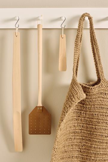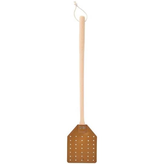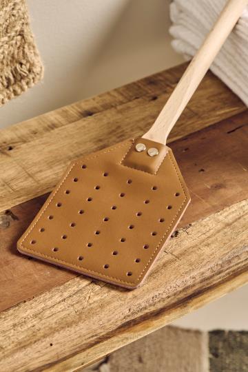Stilfuld fluesmækker med ægte læder og bøgetræ. Skånsom mod overflader og effektiv mod insekter. Med bomuldssnor til ophæng – en elegant hverdagsløsning til det moderne hjem.