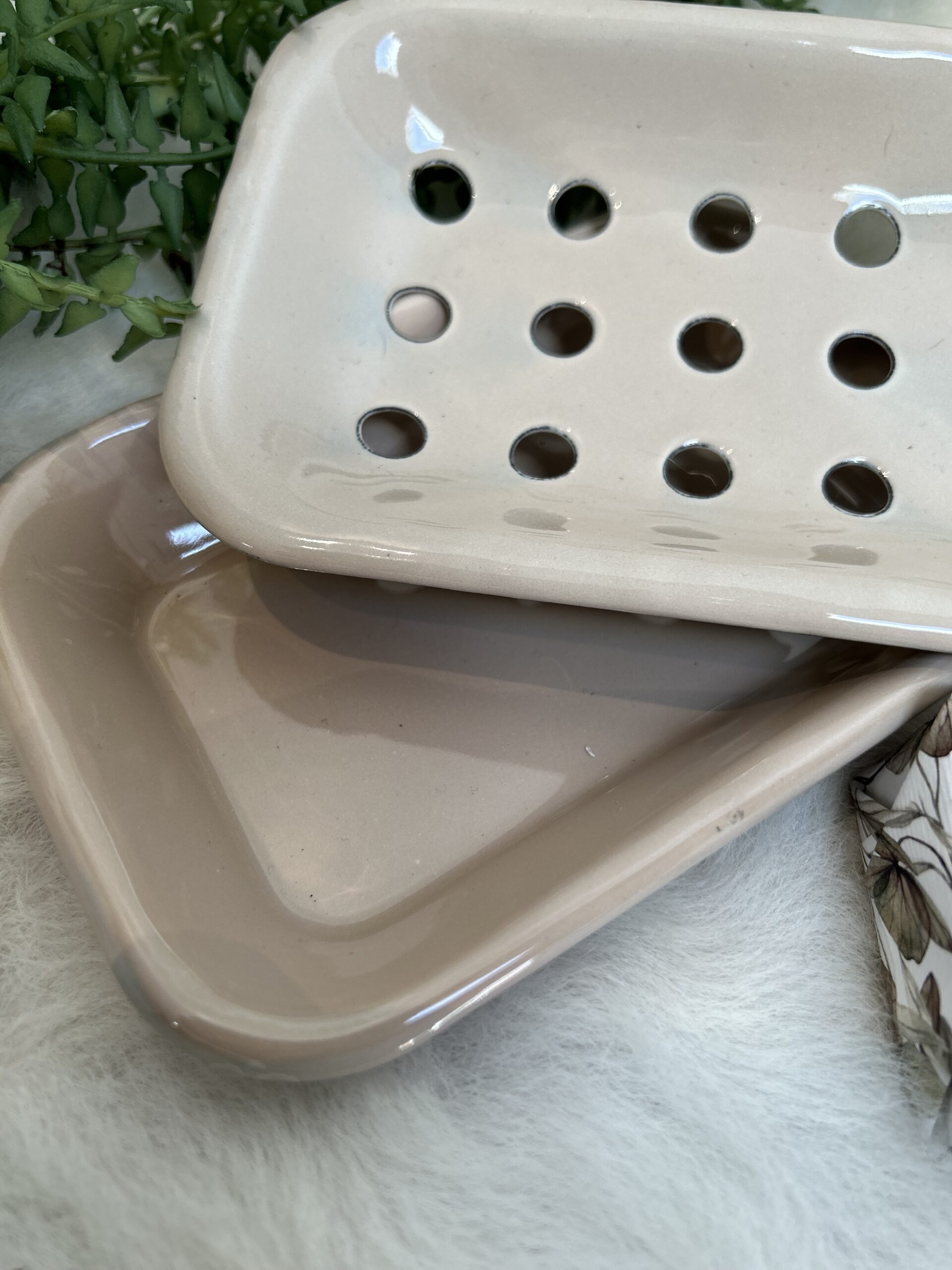Skøn og praktisk 2-delt sæbeskål i sandfarvet emalje, B: 10,5 cm H: 2,5 cm L: 15,5 cm
