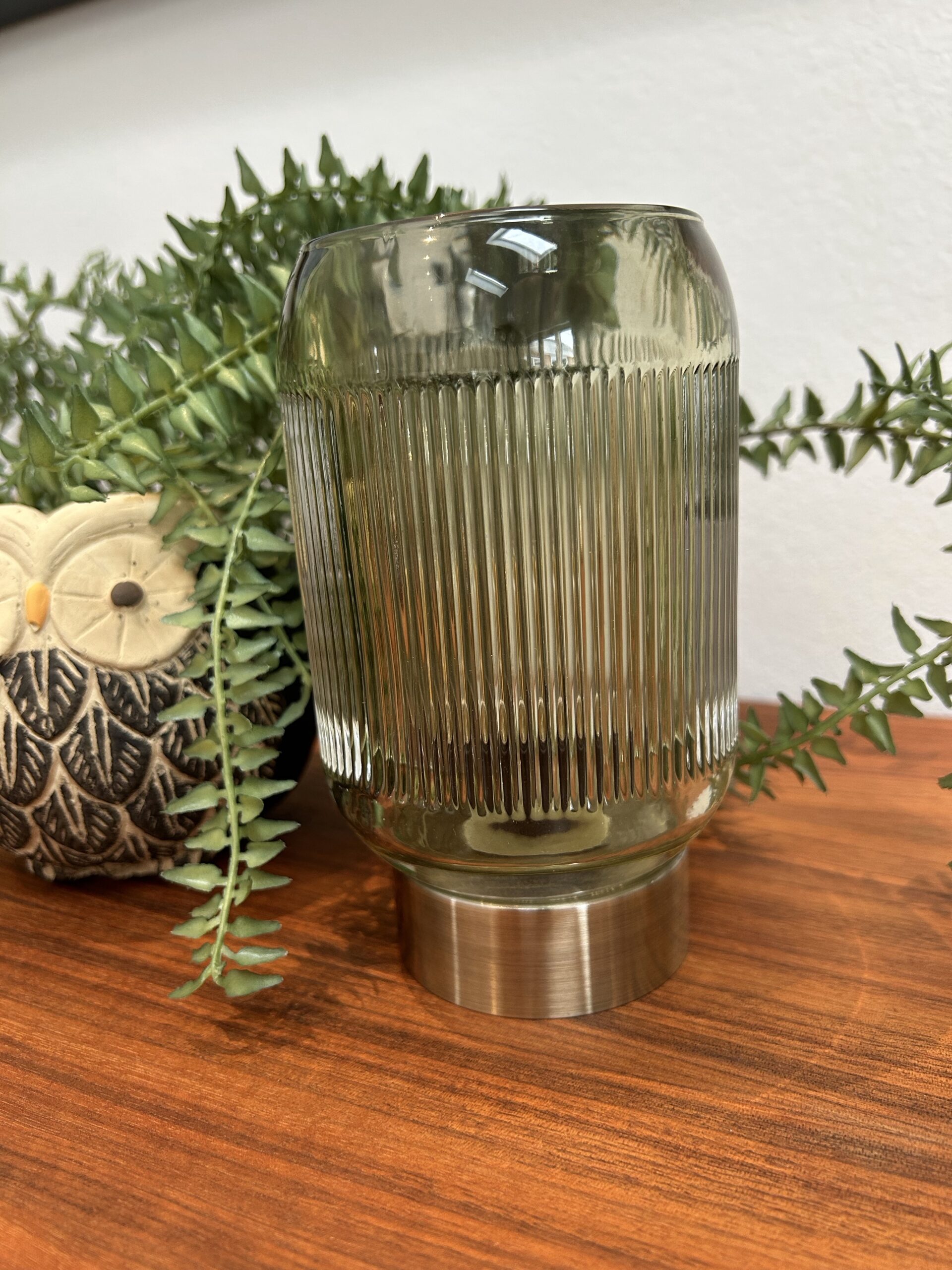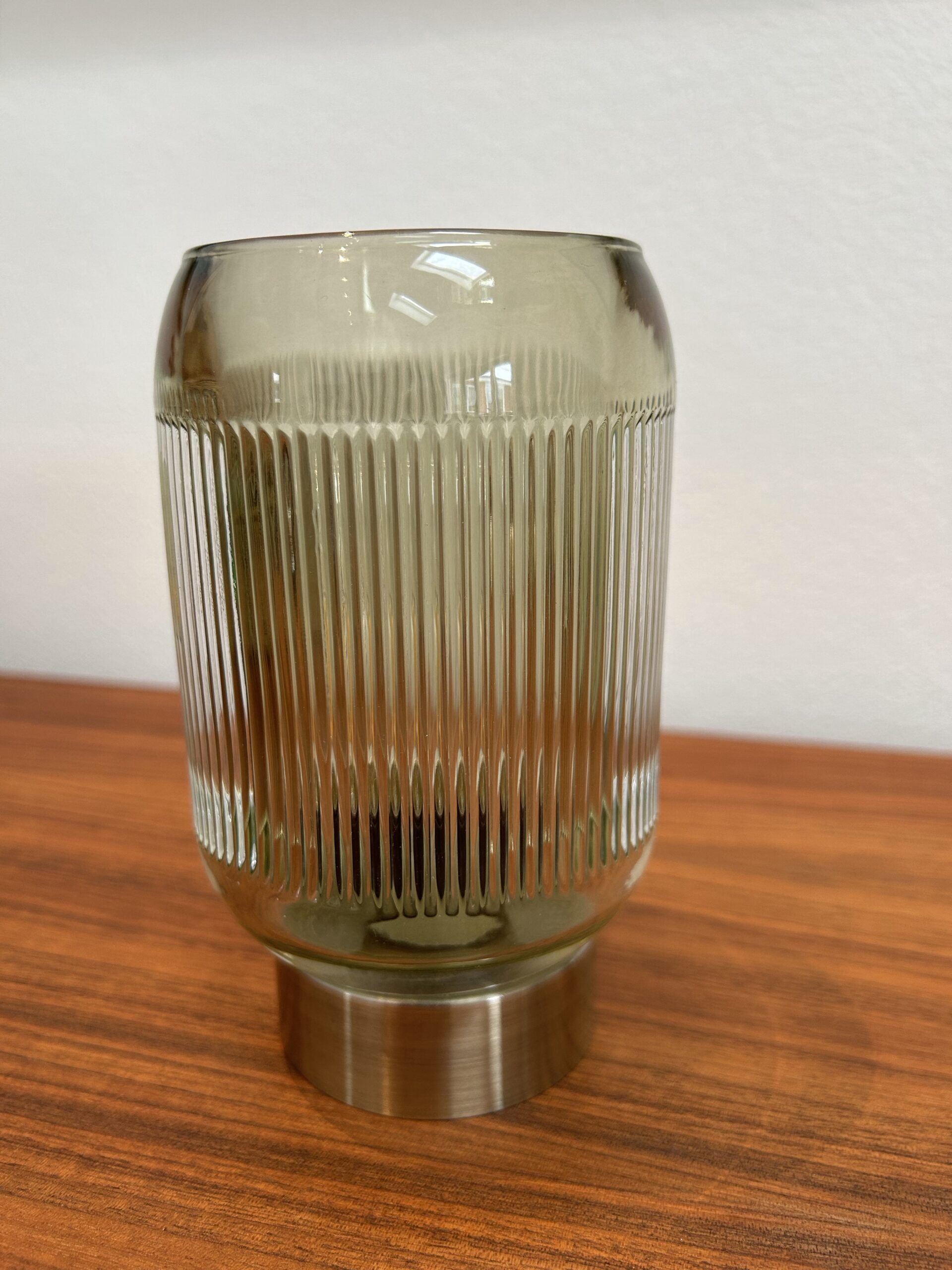 LED lampe med riller i glasset.Perfekt til sommer på terrassen. Tåler ikke vand eller dug. Skal tages ind til aften.