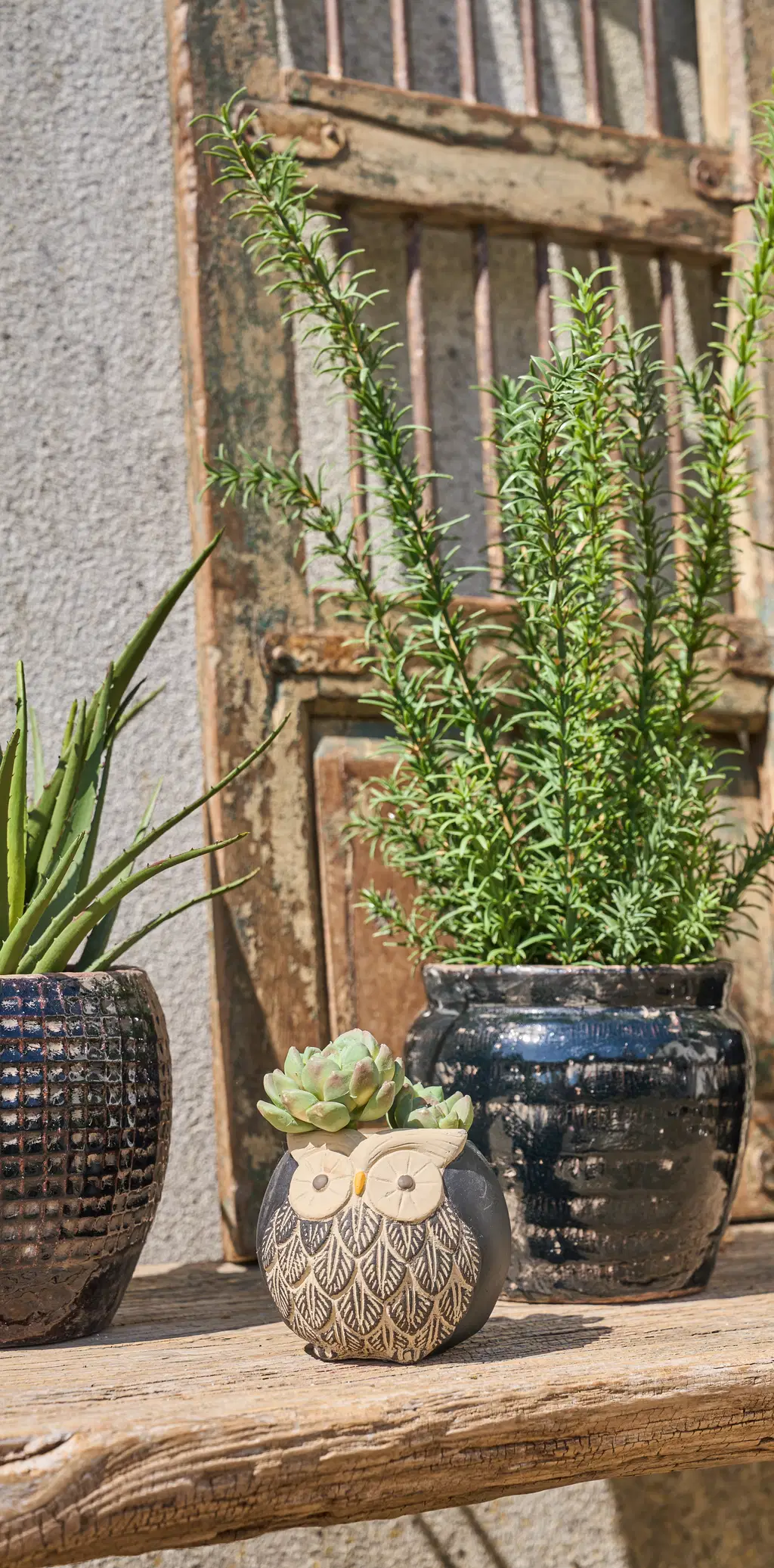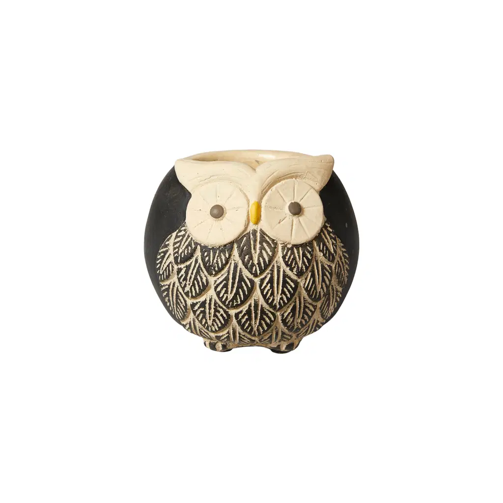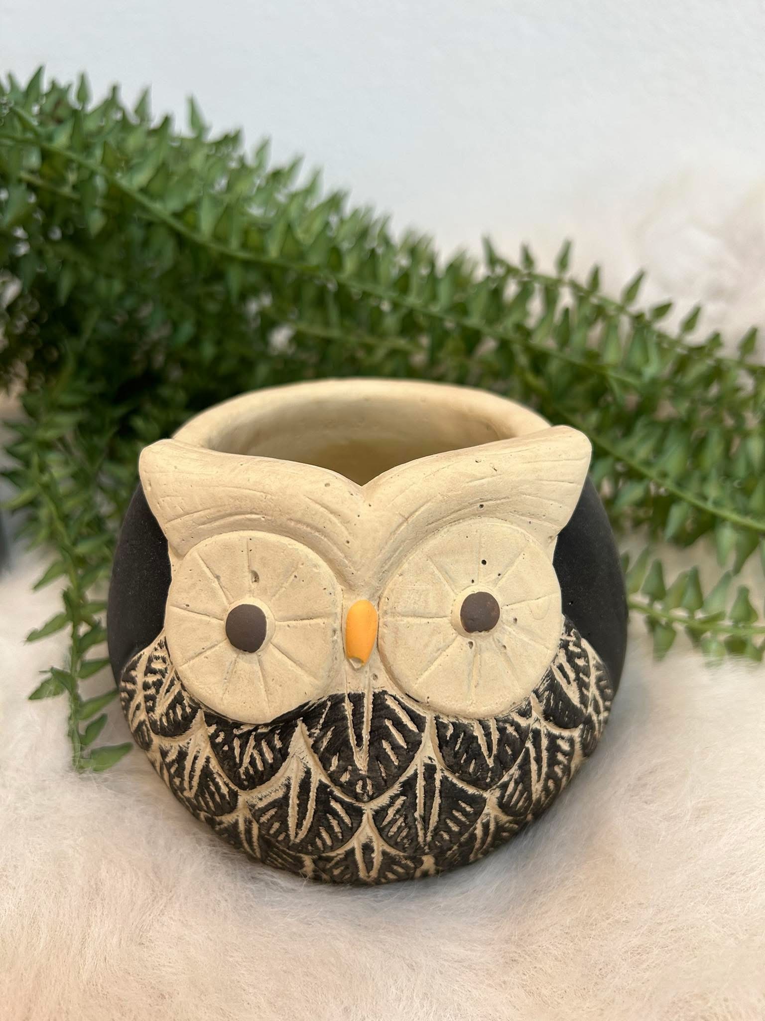 Skjuler i cement formet som ugle. Behandlet indvendigt med vandafvisende maling, men cement er ikke 100% vandtæt. Brug inderskål for en sikkerheds skyld og placer på beskyttet overflade. Leveres med filtdupper.